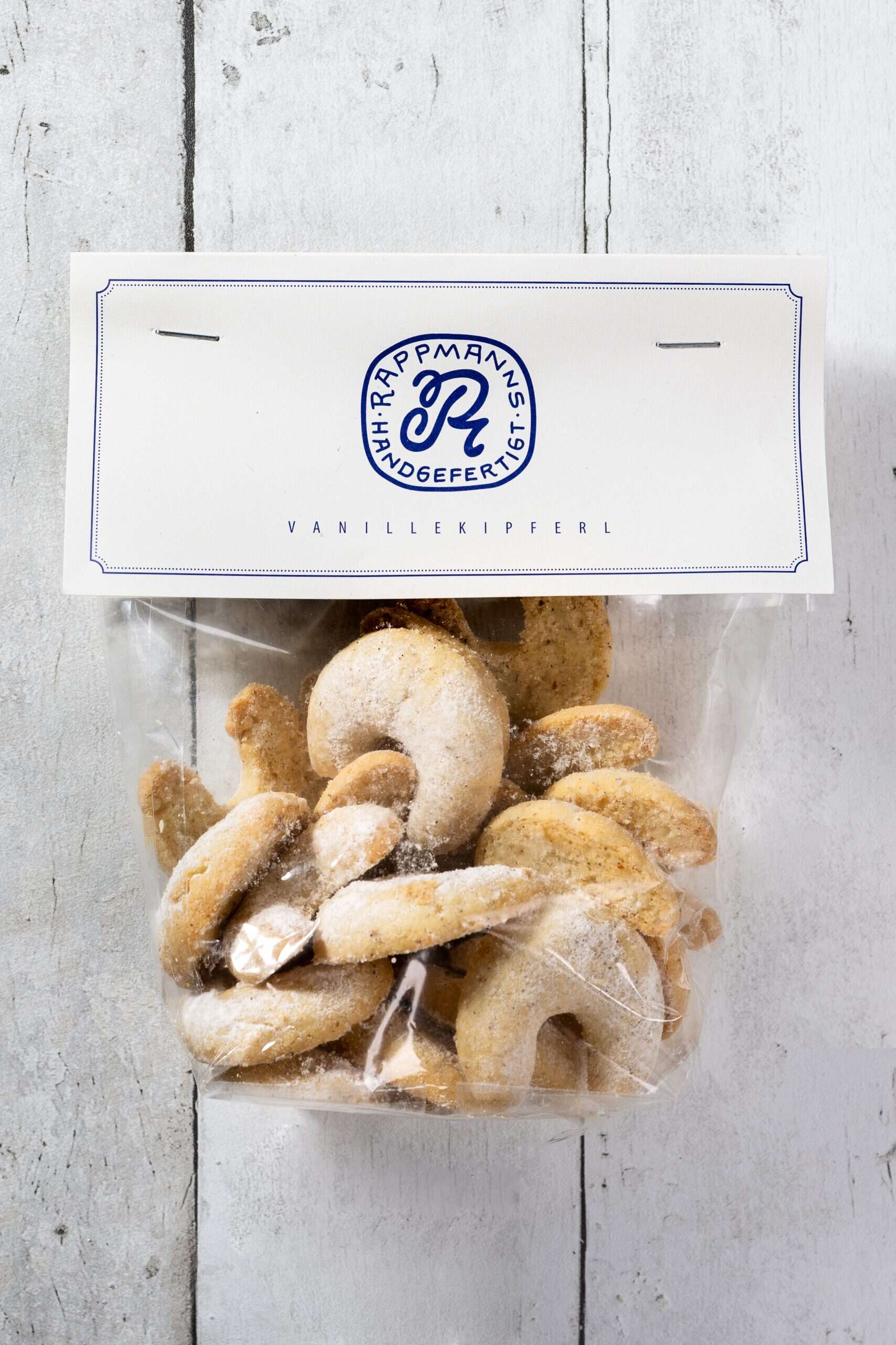 Die handgemachten Vanillekipferl von Rappmanns aus Aachen sind der Inbegriff feinster Backkunst – zart-mürb, wunderbar buttrig, mit gemahlenen Mandeln und veredelt durch echte Bourbon-Vanille. Jedes Kipferl wird mit Liebe geformt und schonend gebacken, so dass es auf der Zunge zergeht.
